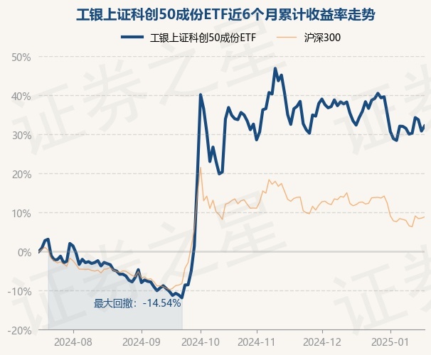 证券之星消息,1月17日,工银上证科创50成份ETF最新单位净值为0.9936元,累计净值为0.6924元,较前一交易日上涨0.99%。历史数据显示该基金近1个月下跌0.18%,近3个月上涨9.79%,近6个月上涨32.15%,近1年上涨27.27%。该基金近6个月的累计收益率走势如下图: