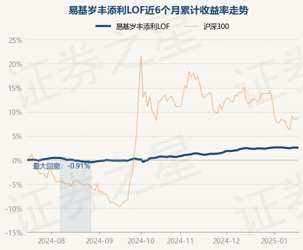 证券之星消息,1月17日,易基岁丰添利LOF最新单位净值为1.6903元,累计净值为2.6013元,较前一交易日上涨0.01%。历史数据显示该基金近1个月上涨0.23%,近3个月上涨2.08%,近6个月上涨2.56%,近1年上涨5.82%。该基金近6个月的累计收益率走势如下图: