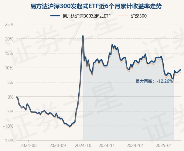 证券之星消息,1月20日,易方达沪深300发起式ETF最新单位净值为3.7642元,累计净值为1.9214元,较前一交易日上涨0.46%。历史数据显示该基金近1个月下跌2.4%,近3个月下跌2.17%,近6个月上涨9.15%,近1年上涨20.39%。该基金近6个月的累计收益率走势如下图: