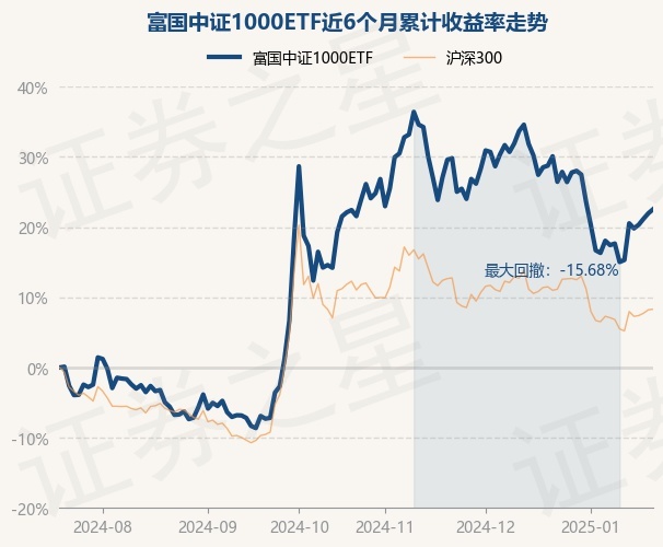 证券之星消息,1月20日,富国中证1000ETF最新单位净值为2.3881元,累计净值为0.8408元,较前一交易日上涨0.64%。历史数据显示该基金近1个月下跌6.25%,近3个月上涨2.27%,近6个月上涨21.97%,近1年上涨11.88%。该基金近6个月的累计收益率走势如下图:
