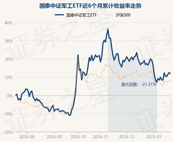 证券之星消息,1月20日,国泰中证军工ETF最新单位净值为1.0021元,累计净值为1.0021元,较前一交易日上涨0.94%。历史数据显示该基金近1个月下跌5.48%,近3个月下跌2.77%,近6个月上涨12.58%,近1年上涨21.38%。该基金近6个月的累计收益率走势如下图: