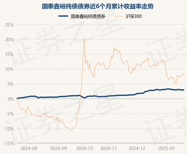 证券之星消息,1月20日,国泰鑫裕纯债债券最新单位净值为1.0503元,累计净值为1.0919元,较前一交易日下跌0.05%。历史数据显示该基金近1个月下跌0.15%,近3个月上涨2.02%,近6个月上涨2.87%,近1年上涨5.55%。该基金近6个月的累计收益率走势如下图: