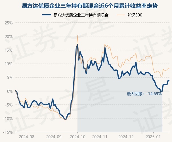 证券之星消息,1月20日,易方达优质企业三年持有期混合最新单位净值为0.8519元,累计净值为0.8519元,较前一交易日上涨1.51%。历史数据显示该基金近1个月下跌2.13%,近3个月下跌5.21%,近6个月上涨3.85%,近1年上涨9.39%。该基金近6个月的累计收益率走势如下图: