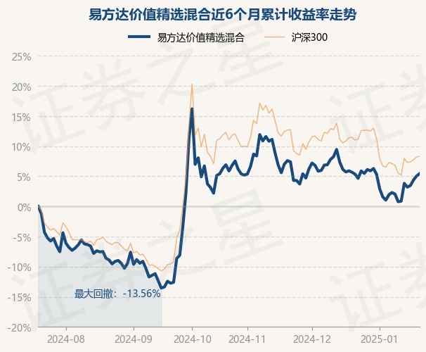 证券之星消息,1月20日,易方达价值精选混合最新单位净值为1.0902元,累计净值为3.8342元,较前一交易日上涨0.63%。历史数据显示该基金近1个月上涨2.56%,近3个月上涨2.78%,近6个月上涨8.05%,近1年上涨12.32%。该基金近6个月的累计收益率走势如下图: