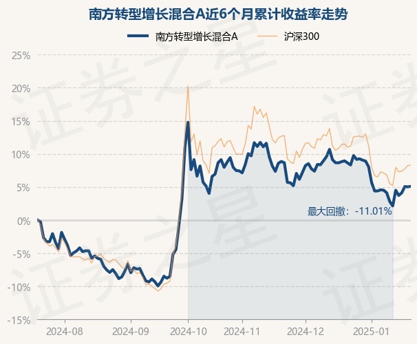 证券之星消息,1月20日,南方转型增长混合A最新单位净值为1.8536元,累计净值为1.8536元,较前一交易日下跌0.05%。历史数据显示该基金近1个月下跌3.34%,近3个月下跌1.48%,近6个月上涨5.01%,近1年上涨13.23%。该基金近6个月的累计收益率走势如下图: