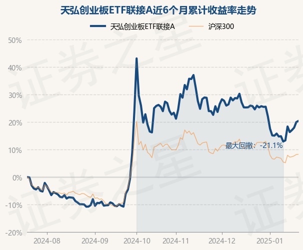 证券之星消息,1月21日,天弘创业板ETF联接A最新单位净值为0.8647元,累计净值为0.8647元,较前一交易日上涨0.35%。历史数据显示该基金近1个月下跌4.27%,近3个月下跌4.35%,近6个月上涨20.43%,近1年上涨22.36%。该基金近6个月的累计收益率走势如下图: