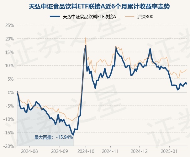 证券之星消息,1月21日,天弘中证食品饮料ETF联接A最新单位净值为2.1663元,累计净值为2.2444元,较前一交易日下跌0.53%。历史数据显示该基金近1个月下跌6.15%,近3个月下跌1.31%,近6个月上涨2.93%,近1年下跌1.75%。该基金近6个月的累计收益率走势如下图: