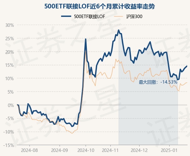 证券之星消息,1月21日,500ETF联接LOF最新单位净值为1.5776元,累计净值为1.6776元,较前一交易日上涨0.33%。历史数据显示该基金近1个月下跌4.58%,近3个月下跌1.24%,近6个月上涨14.52%,近1年上涨12.91%。该基金近6个月的累计收益率走势如下图: