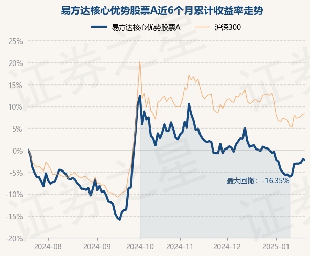证券之星消息,1月21日,易方达核心优势股票A最新单位净值为0.6695元,累计净值为0.6695元,较前一交易日下跌0.27%。历史数据显示该基金近1个月下跌2.36%,近3个月下跌4.89%,近6个月下跌2.31%,近1年上涨6.93%。该基金近6个月的累计收益率走势如下图:
