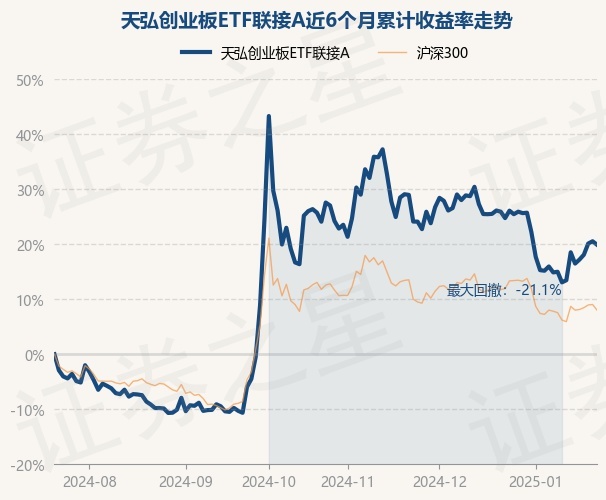 证券之星消息,1月22日,天弘创业板ETF联接A最新单位净值为0.8602元,累计净值为0.8602元,较前一交易日下跌0.52%。历史数据显示该基金近1个月下跌4.77%,近3个月下跌5.12%,近6个月上涨19.92%,近1年上涨25.08%。该基金近6个月的累计收益率走势如下图: