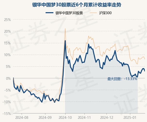 证券之星消息,1月22日,银华中国梦30股票最新单位净值为1.327元,累计净值为1.61元,较前一交易日下跌0.97%。历史数据显示该基金近1个月下跌3.21%,近3个月下跌3.98%,近6个月上涨3.03%,近1年上涨5.15%。该基金近6个月的累计收益率走势如下图: