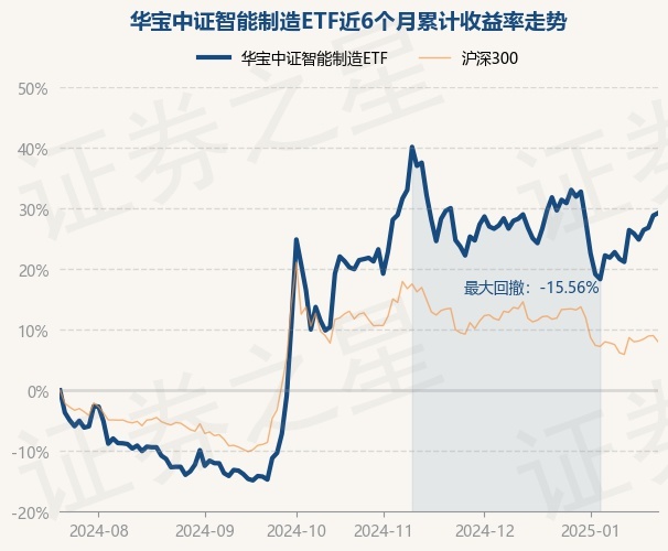 证券之星消息,1月22日,华宝中证智能制造ETF最新单位净值为1.1127元,累计净值为1.1127元,较前一交易日上涨0.32%。历史数据显示该基金近1个月下跌1.96%,近3个月上涨6.54%,近6个月上涨29.26%,近1年上涨44.98%。该基金近6个月的累计收益率走势如下图: