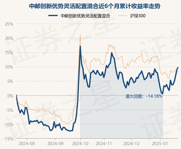 证券之星消息,1月22日,中邮创新优势灵活配置混合最新单位净值为1.024元,累计净值为1.024元,较前一交易日上涨0.59%。历史数据显示该基金近1个月上涨1.79%,近3个月上涨0.99%,近6个月上涨9.75%,近1年上涨25.64%。该基金近6个月的累计收益率走势如下图:
