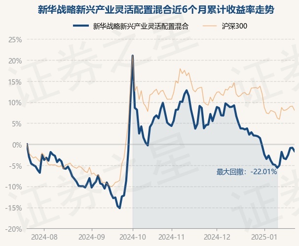证券之星消息,1月22日,新华战略新兴产业灵活配置混合最新单位净值为0.8079元,累计净值为0.8079元,较前一交易日下跌0.81%。历史数据显示该基金近1个月下跌5.21%,近3个月下跌7.53%,近6个月下跌1.64%,近1年下跌10.61%。该基金近6个月的累计收益率走势如下图: