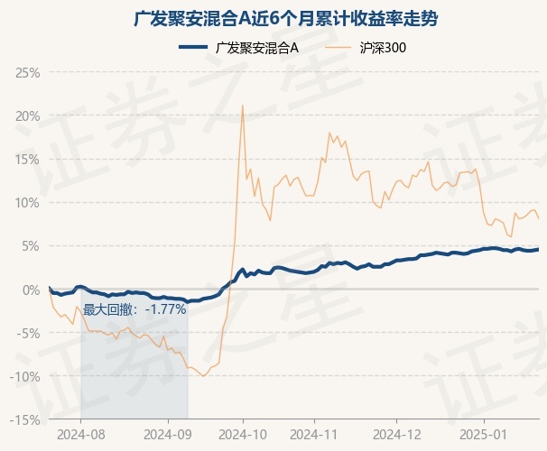 证券之星消息,1月22日,广发聚安混合A最新单位净值为1.416元,累计净值为1.83元,较前一交易日上涨0.07%。历史数据显示该基金近1个月上涨0.35%,近3个月上涨2.09%,近6个月上涨4.5%,近1年上涨9.26%。该基金近6个月的累计收益率走势如下图: