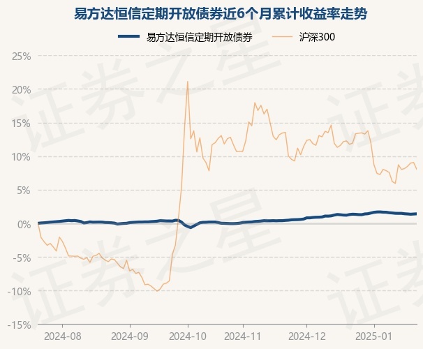 证券之星消息,1月22日,易方达恒信定期开放债券最新单位净值为1.0351元,累计净值为1.2741元,较前一交易日上涨0.03%。历史数据显示该基金近1个月上涨0.11%,近3个月上涨1.3%,近6个月上涨1.41%,近1年上涨4.1%。该基金近6个月的累计收益率走势如下图: