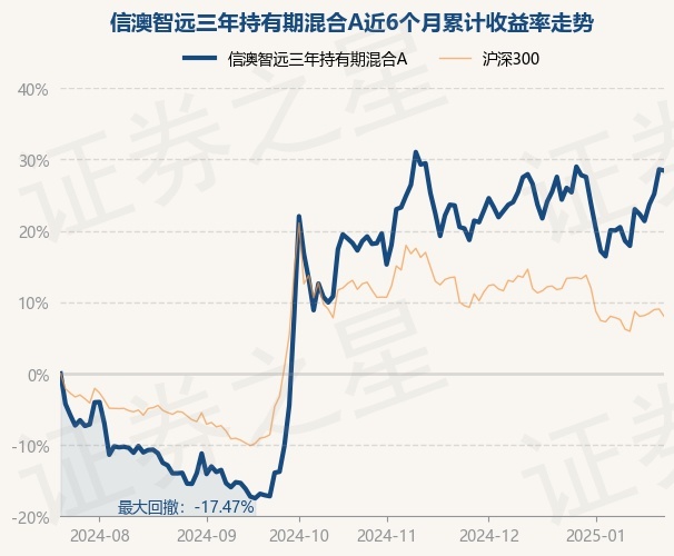 证券之星消息,1月22日,信澳智远三年持有期混合A最新单位净值为0.772元,累计净值为0.772元,较前一交易日下跌0.13%。历史数据显示该基金近1个月上涨0.69%,近3个月上涨8.02%,近6个月上涨28.45%,近1年上涨34.35%。该基金近6个月的累计收益率走势如下图:
