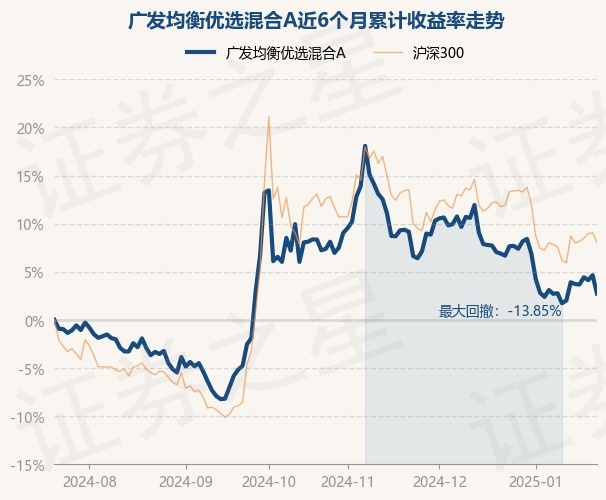 证券之星消息,1月22日,广发均衡优选混合A最新单位净值为0.9847元,累计净值为0.9847元,较前一交易日下跌1.81%。历史数据显示该基金近1个月下跌3.88%,近3个月下跌5.19%,近6个月上涨2.74%,近1年上涨13.03%。该基金近6个月的累计收益率走势如下图: