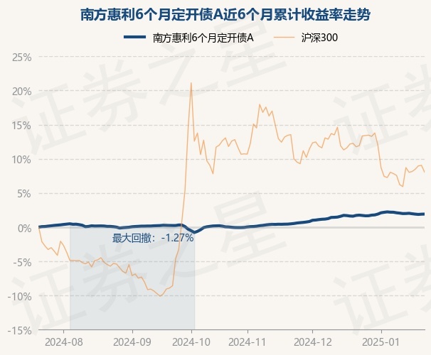 证券之星消息,1月22日,南方惠利6个月定开债A最新单位净值为1.2478元,累计净值为1.2878元,较前一交易日上涨0.02%。历史数据显示该基金近1个月上涨0.19%,近3个月上涨1.76%,近6个月上涨1.91%,近1年上涨4.65%。该基金近6个月的累计收益率走势如下图: