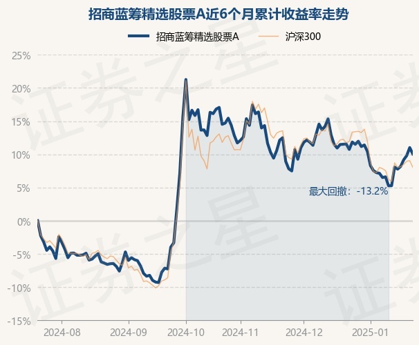 证券之星消息,1月22日,招商蓝筹精选股票A最新单位净值为0.6444元,累计净值为0.6444元,较前一交易日下跌0.86%。历史数据显示该基金近1个月下跌1.35%,近3个月下跌5.78%,近6个月上涨10.06%,近1年上涨23.12%。该基金近6个月的累计收益率走势如下图: