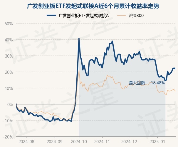 证券之星消息,1月22日,广发创业板ETF发起式联接A最新单位净值为1.1543元,累计净值为1.1543元,较前一交易日下跌0.54%。历史数据显示该基金近1个月下跌4.83%,近3个月下跌4.62%,近6个月上涨21.71%,近1年上涨26.07%。该基金近6个月的累计收益率走势如下图: