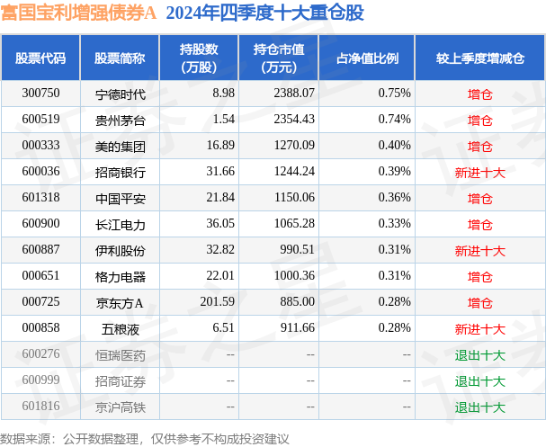 富国宝利增强债券A为债券型-混合二级基金,根据最新一期基金季报显示,该基金资产配置:股票占净值比19.2%,债券占净值比81.93%,现金占净值比4.03%。基金十大重仓股如下: