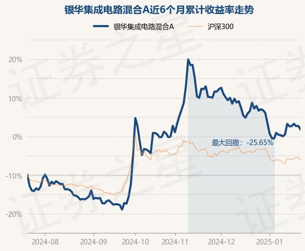 证券之星消息,1月22日,银华集成电路混合A最新单位净值为0.9765元,累计净值为0.9765元,较前一交易日下跌1.42%。历史数据显示该基金近1个月下跌10.03%,近3个月上涨2.12%,近6个月上涨23.65%,近1年上涨31.27%。该基金近6个月的累计收益率走势如下图: