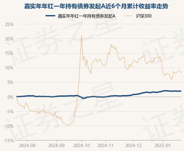 证券之星消息,1月22日,嘉实年年红一年持有债券发起A最新单位净值为1.0742元,累计净值为1.0984元,较前一交易日上涨0.0%。历史数据显示该基金近1个月上涨0.38%,近3个月上涨1.91%,近6个月上涨1.91%,近1年上涨4.19%。该基金近6个月的累计收益率走势如下图:
