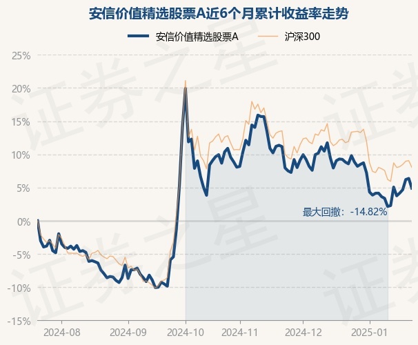 证券之星消息,1月22日,安信价值精选股票A最新单位净值为3.4444元,累计净值为3.4444元,较前一交易日下跌1.37%。历史数据显示该基金近1个月下跌3.6%,近3个月下跌4.33%,近6个月上涨4.91%,近1年上涨7.23%。该基金近6个月的累计收益率走势如下图: