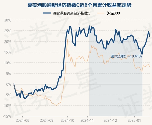 证券之星消息,1月22日,嘉实港股通新经济指数C最新单位净值为0.903元,累计净值为0.903元,较前一交易日下跌1.77%。历史数据显示该基金近1个月上涨1.14%,近3个月下跌0.95%,近6个月上涨22.23%,近1年上涨42.18%。该基金近6个月的累计收益率走势如下图: