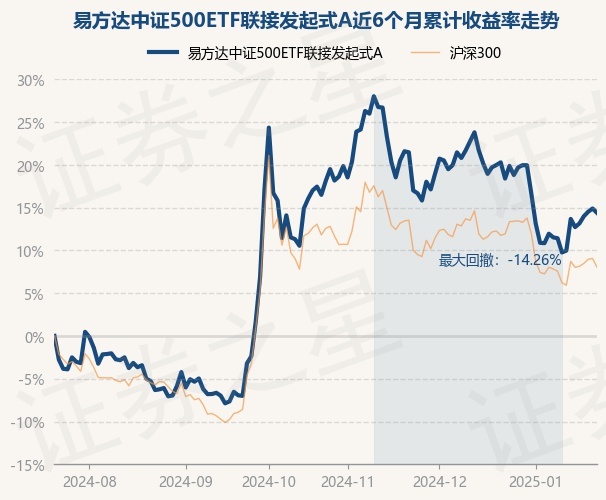 证券之星消息,1月22日,易方达中证500ETF联接发起式A最新单位净值为1.3164元,累计净值为1.3164元,较前一交易日下跌0.44%。历史数据显示该基金近1个月下跌4.91%,近3个月下跌2.24%,近6个月上涨14.39%,近1年上涨17.75%。该基金近6个月的累计收益率走势如下图: