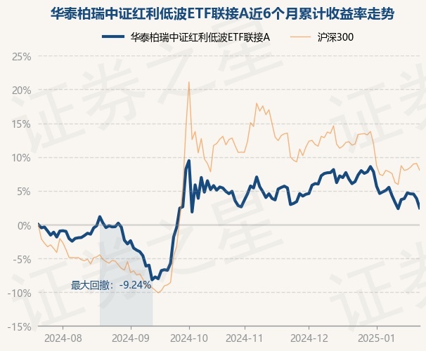 证券之星消息,1月22日,华泰柏瑞中证红利低波ETF联接A最新单位净值为1.5722元,累计净值为1.8022元,较前一交易日下跌1.34%。历史数据显示该基金近1个月下跌3.37%,近3个月下跌2.94%,近6个月上涨2.46%,近1年上涨17.26%。该基金近6个月的累计收益率走势如下图: