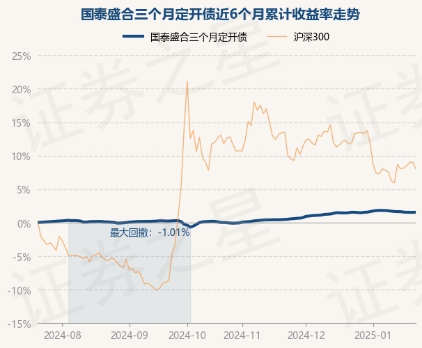 证券之星消息,1月22日,国泰盛合三个月定开债最新单位净值为1.1312元,累计净值为1.1811元,较前一交易日上涨0.02%。历史数据显示该基金近1个月上涨0.06%,近3个月上涨1.42%,近6个月上涨1.55%,近1年上涨4.12%。该基金近6个月的累计收益率走势如下图: