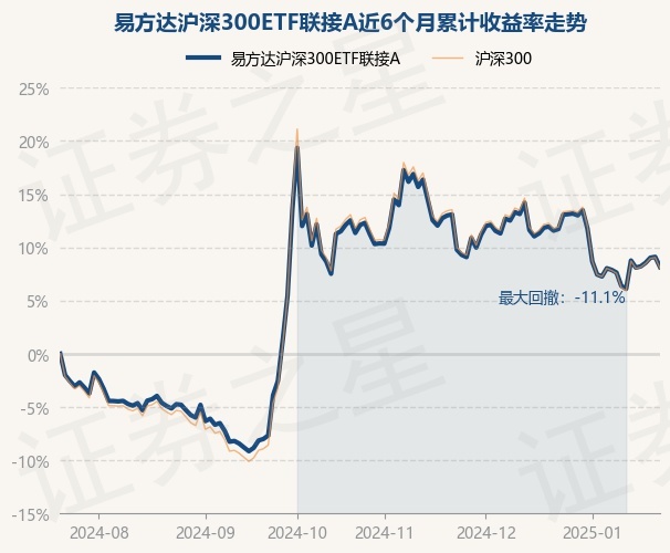 证券之星消息,1月22日,易方达沪深300ETF联接A最新单位净值为1.5023元,累计净值为1.5023元,较前一交易日下跌0.87%。历史数据显示该基金近1个月下跌3.06%,近3个月下跌3.53%,近6个月上涨8.16%,近1年上涨19.72%。该基金近6个月的累计收益率走势如下图: