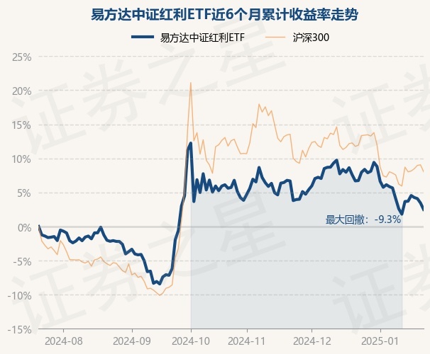 证券之星消息,1月22日,易方达中证红利ETF最新单位净值为1.2985元,累计净值为1.5695元,较前一交易日下跌0.92%。历史数据显示该基金近1个月下跌3.93%,近3个月下跌3.24%,近6个月上涨2.46%,近1年上涨15.52%。该基金近6个月的累计收益率走势如下图: