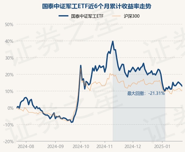 证券之星消息,1月23日,国泰中证军工ETF最新单位净值为0.9806元,累计净值为0.9806元,较前一交易日下跌0.83%。历史数据显示该基金近1个月下跌5.81%,近3个月下跌9.71%,近6个月上涨12.89%,近1年上涨22.7%。该基金近6个月的累计收益率走势如下图: