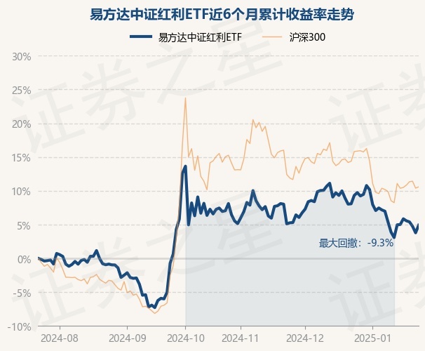证券之星消息,1月23日,易方达中证红利ETF最新单位净值为1.3125元,累计净值为1.5835元,较前一交易日上涨1.08%。历史数据显示该基金近1个月下跌2.94%,近3个月下跌2.37%,近6个月上涨4.86%,近1年上涨15.38%。该基金近6个月的累计收益率走势如下图: