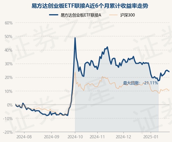 证券之星消息,1月23日,易方达创业板ETF联接A最新单位净值为2.1494元,累计净值为2.1494元,较前一交易日下跌0.35%。历史数据显示该基金近1个月下跌4.1%,近3个月下跌4.81%,近6个月上涨24.01%,近1年上涨22.96%。该基金近6个月的累计收益率走势如下图: