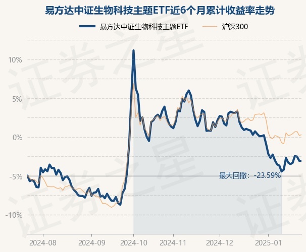 证券之星消息,1月23日,易方达中证生物科技主题ETF最新单位净值为0.4215元,累计净值为0.4215元,较前一交易日下跌0.02%。历史数据显示该基金近1个月下跌6.08%,近3个月下跌10.28%,近6个月上涨3.84%,近1年下跌9.69%。该基金近6个月的累计收益率走势如下图: