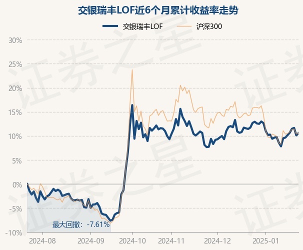 证券之星消息,1月23日,交银瑞丰LOF最新单位净值为1.1095元,累计净值为1.1095元,较前一交易日上涨0.42%。历史数据显示该基金近1个月下跌1.04%,近3个月下跌1.43%,近6个月上涨10.56%,近1年上涨9.56%。该基金近6个月的累计收益率走势如下图: