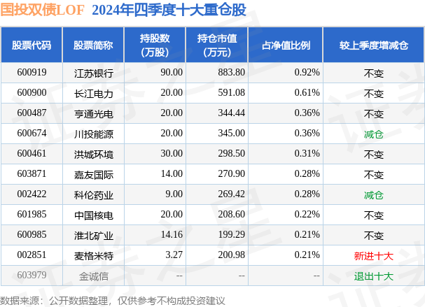 国投双债LOF为债券型-混合一级基金,根据最新一期基金季报显示,该基金资产配置:股票占净值比4.97%,债券占净值比121.51%,现金占净值比3.09%。基金十大重仓股如下: