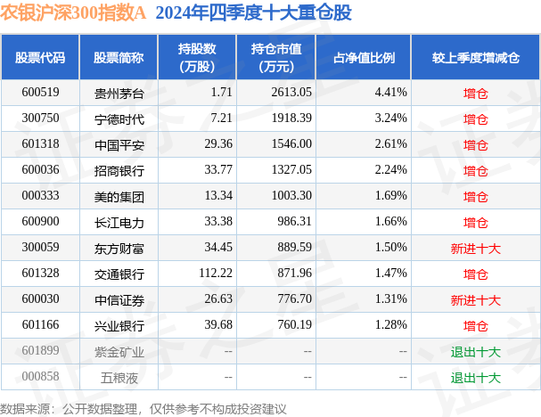 农银沪深300指数A为指数型-股票基金,根据最新一期基金季报显示,该基金资产配置:股票占净值比94.88%,债券占净值比3.0%,现金占净值比2.37%。基金十大重仓股如下:
