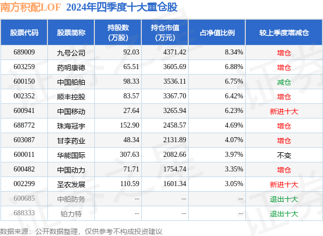 南方积配LOF为混合型-灵活基金,根据最新一期基金季报显示,该基金资产配置:股票占净值比80.46%,无债券类资产,现金占净值比20.36%。基金十大重仓股如下: