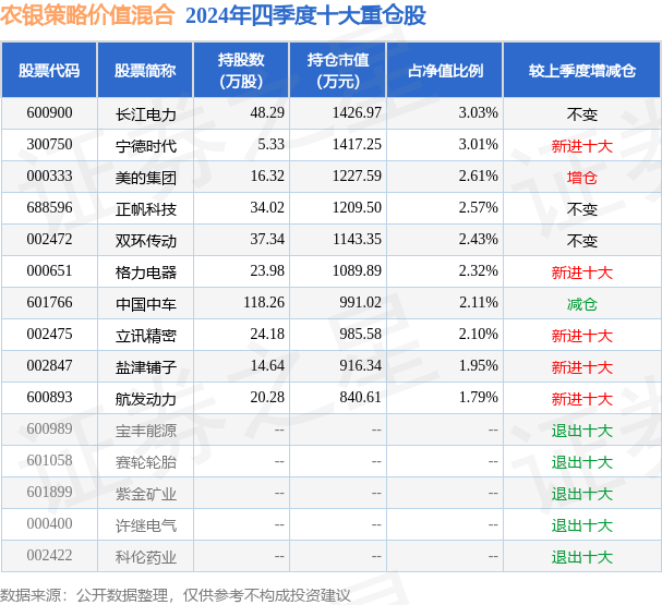 农银策略价值混合为混合型-偏股基金,根据最新一期基金季报显示,该基金资产配置:股票占净值比81.21%,无债券类资产,现金占净值比19.22%。基金十大重仓股如下: