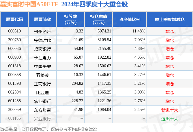 嘉实富时中国A50ETF为指数型-股票基金,根据最新一期基金季报显示,该基金资产配置:股票占净值比99.66%,无债券类资产,现金占净值比0.64%。基金十大重仓股如下: