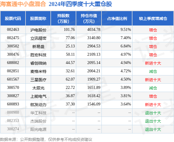 海富通中小盘混合为混合型-偏股基金,根据最新一期基金季报显示,该基金资产配置:股票占净值比89.58%,无债券类资产,现金占净值比9.34%。基金十大重仓股如下: