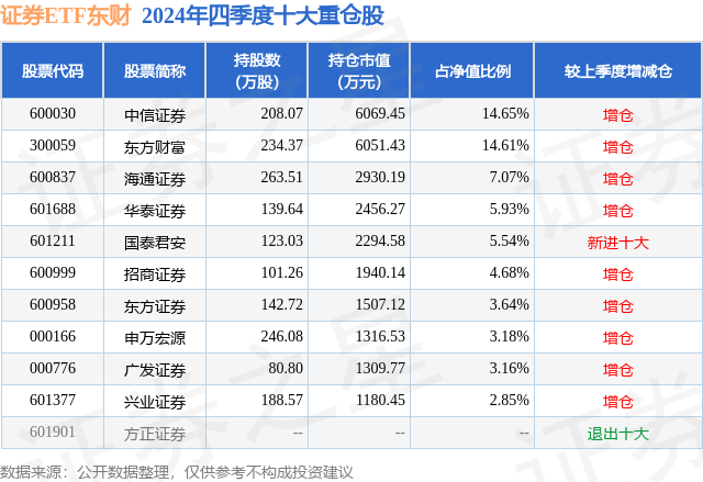 证券ETF东财为指数型-股票基金,根据最新一期基金季报显示,该基金资产配置:股票占净值比98.97%,无债券类资产,现金占净值比1.26%。基金十大重仓股如下: