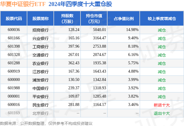 华夏中证银行ETF为指数型-股票基金,根据最新一期基金季报显示,该基金资产配置:股票占净值比99.78%,无债券类资产,现金占净值比0.68%。基金十大重仓股如下: