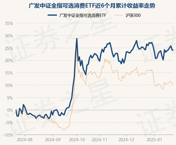 证券之星消息,1月23日,广发中证全指可选消费ETF最新单位净值为1.9522元,累计净值为1.9522元,较前一交易日上涨0.0%。历史数据显示该基金近1个月下跌0.49%,近3个月上涨1.28%,近6个月上涨23.54%,近1年上涨33.45%。该基金近6个月的累计收益率走势如下图: