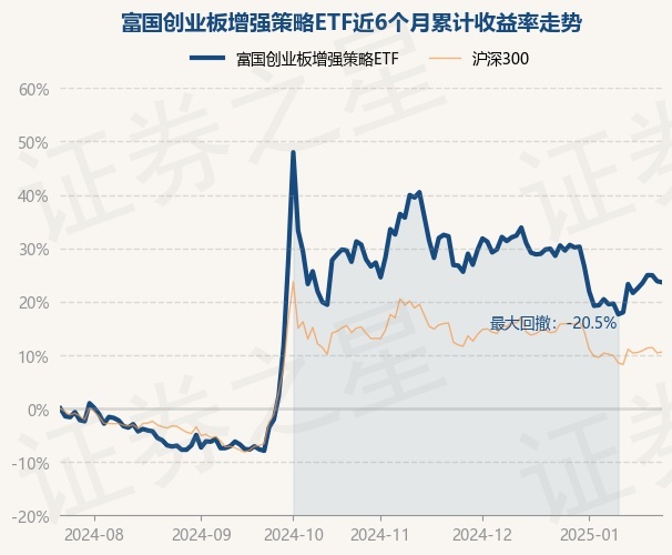 证券之星消息,1月23日,富国创业板增强策略ETF最新单位净值为0.8778元,累计净值为0.8778元,较前一交易日下跌0.16%。历史数据显示该基金近1个月下跌3.86%,近3个月下跌4.6%,近6个月上涨23.63%,近1年上涨22.91%。该基金近6个月的累计收益率走势如下图: